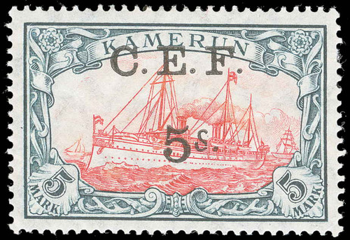 Description 65 var footnoted (B13b) 1915 5' on 5m Yacht overprinted "C.E.F.", ERROR - "S" broken at top (row 3, pos 1), rare as only 100 were printed, perfectly centered.