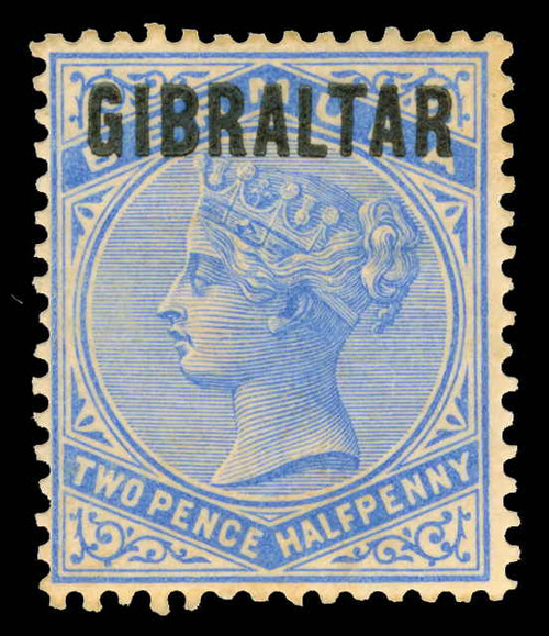 4 var (4a) 1886 2½d ultramarine Q Victoria of Bermuda with scarce blue-black "GIBRALTAR" overprint, wmkd CA, perf 14, especially difficult mint (in our experience the vast majority were used), a rare and challenging stamp, undercatalogued and seldom offered.