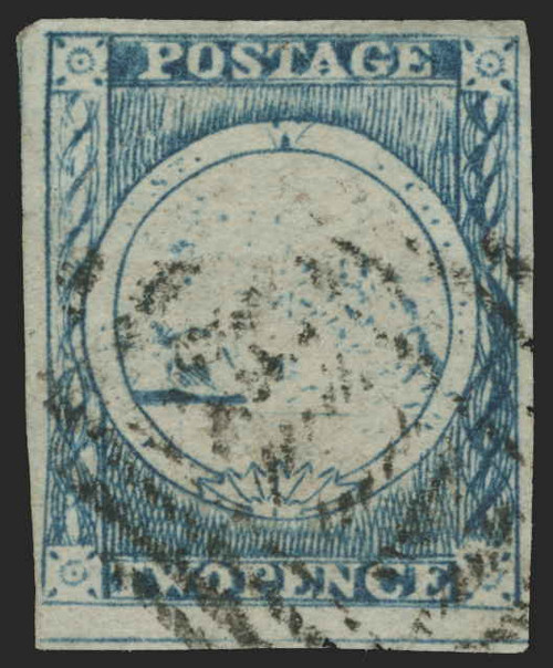Description 3d (18) 1850 2d dull blue Sydney View, Plate 1, later impression, imperf, four full margins--showing portion of adjoining stamp at bottom, used.