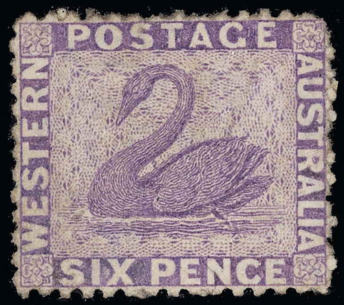 33b var (60x) 1875 6d mauve Swan, perf 12½, ERROR - wmk CC reversed, perfectly centered.