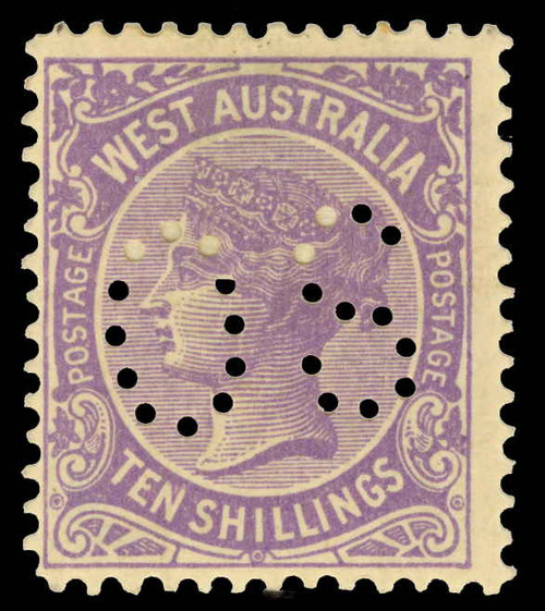 Description 87 var (127 var footnoted) 1902 10' deep mauve Q Victoria, wmkd V over Crown, perf 12½, VARIETY - perforated "OS" (Australia SG Type O2 var - "S" with 12 holes, issued in N.S.W.), scarce.