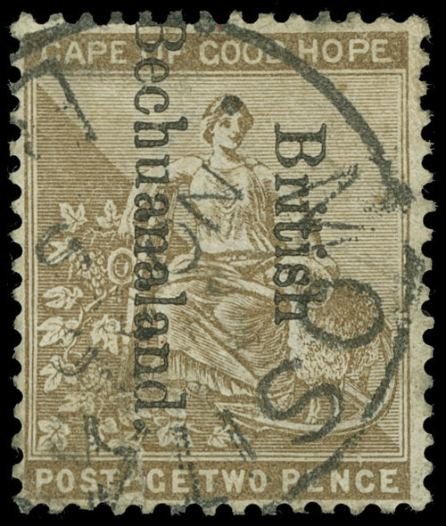 Description 39 (39) 1895 2d bistre Hope overprinted "British Bechuanaland" SG Type 10 reading downwards, wmkd Cabled Anchor, perf 14, this is the UNIQUE example of the "MOSITA BB" cds from the Bechuanaland period.