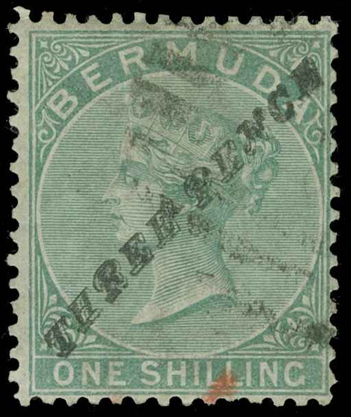 Description 12a (13b) 1874 3d on 1' green Q Victoria^ provisional, SG Type 6a surcharge ("P" same type as "R"), wmkd CC, perf 14, used.
