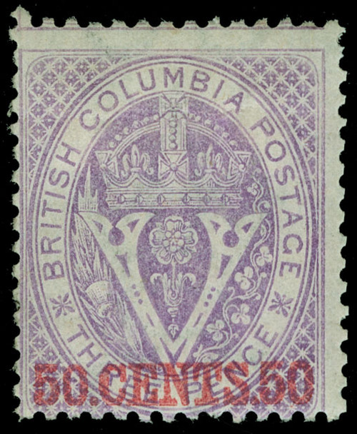Description 12 (32) 1871 50¢ on 3d mauve Seal of British Columbia, surcharged SG Type 6 in red, wmkd CC, perf 14.