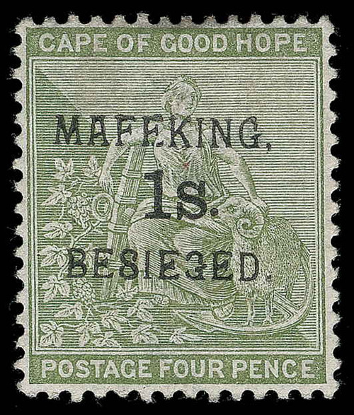 166 (5) 1900 1' on 4d sage-green Hope surcharged and overprinted "MAFEKING BESIEGED", only 1440 surcharged, rare mint as the vast majority were postally used, position 4 (broken "G" in "BESIEGED"), well centered.