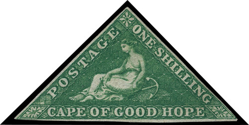 6 (8) 1858 1' bright yellow-green Cape Triangle, white paper, wmkd Anchor, Perkins, Bacon ptg, a comparatively rare and definitely undercatalogued mint stamp, as the largest portion of this printing was used (only 1 mint multiple - a pair - is known), imperf, full margins, signed Roumet.