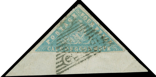 Description 9 (14) 1861 4d pale milky blue Wood-block, laid paper, imperf, full margins, an attractive example, tied to piece by light triangular grid cancel, signed Sismondo.