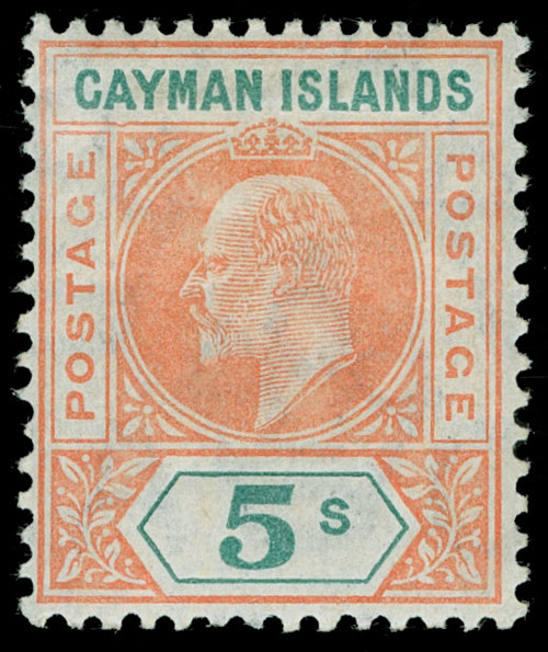 Description 16a (16a) 1907 5' salmon and green K Edward VII, wmkd MCA, perf 14, VARIETY - "Glover flaw" dented frame (under "A", row 1, pos 6 of left pane), only 40 examples printed.