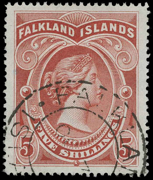 Description 21 (42) 1898 5' red Q Victoria^, wmkd Crown CC, perf 14,14½, only 6000 printed, nice double-ring "Falkland Islands" cds.