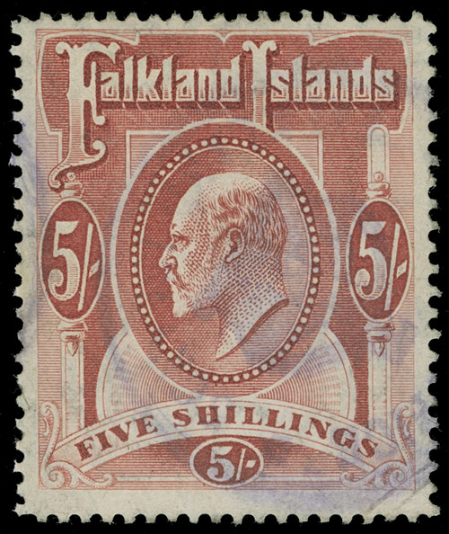 Description 28-29 (49-50) 1912 3'-5' K Edward VII, wmkd MCA, perf 14, each with scarce "Crown Post Office Falkland Islands" cancel in violet.