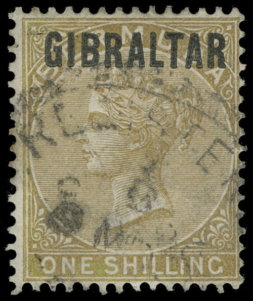 Description 1-7 (1-7) 1886 ½d-1' Q Victoria of Bermuda overprinted "GIBRALTAR", wmkd CA, perf 14, cplt (7), light cancels mostly.