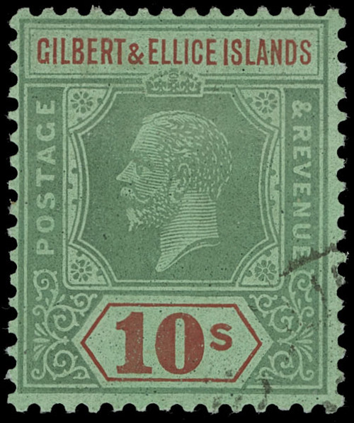 Description 31 (35) 1924 10' green and red on emerald K George V, Die II, wmkd Script CA, perf 14, undercatalogued used, very lightly canceled.