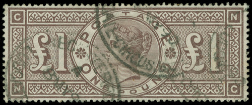 Description 110 (185) 1884 £1 brown-lilac Q Victoria (frame complete), wmkd Three Imperial Crowns, perf 14, a remarkable perfectly centered example, with deep rich color, used.