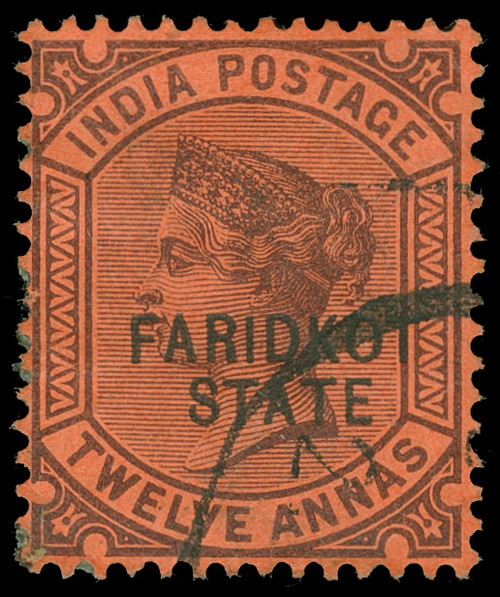 Description 14 (14) 1900 12a purple on red Q Victoria of India overprinted "FARIDKOT STATE" SG Type 1, scarce and undercatalogued used, lightly canceled.