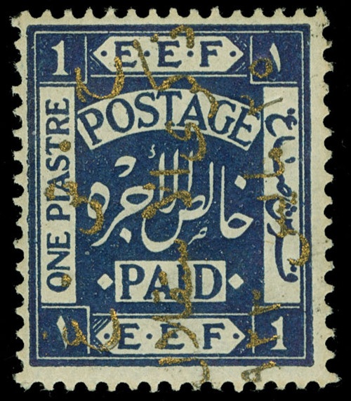 Description 78 var (103A var) 1923 1p deep indigo stamp of Palestine overprinted SG Type 11 reading downwards, VARIETY - overprint in gold, rare, only 24 printed of both colored overprints (per Najjar).