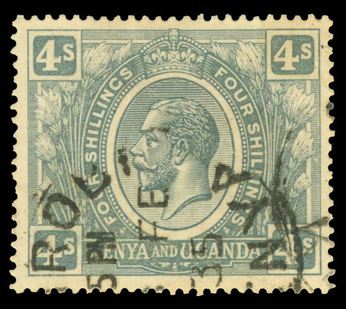 Description 33 var (91w) 1925 4' grey K George V on chalk-surfaced paper, perf 14, VARIETY - wmkd Crown to right of CA, scarce, especially used!, light "Kampala Uganda" cds.