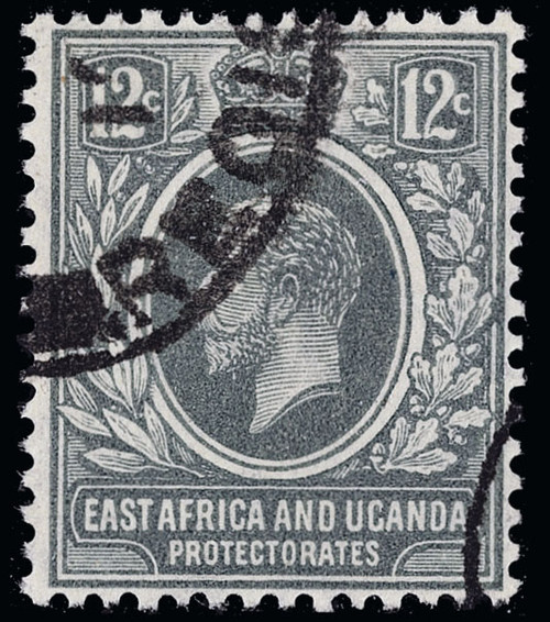 5 (69) 1921-22 12¢ slate-grey K George V, wmkd Script CA, perf 14, this is among the rarest used 20th-Century East Africa stamps, vastly undercatalogued.