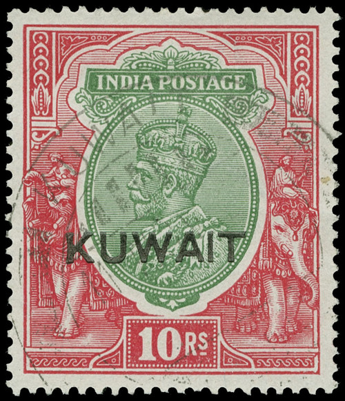 Description 1-15 (1-15) 1923-24 ½a-10R K George V of India overprinted "KUWAIT" SG Types 1 and 2, wmkd Large Star, perf 14, cplt (15), undercatalogued by all in this very strong market!, a rare used set, lightly canceled.