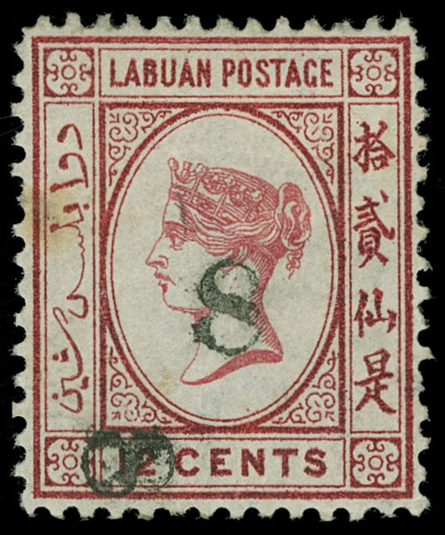 Description 12b (13) 1880 8¢ on 12¢ carmine Q Victoria, surcharged in black SG Type 3 (a vertical and a horizontal "8").