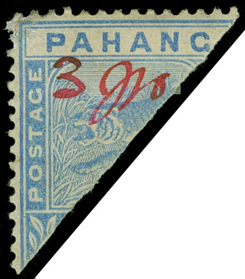 Description 22 (18d) 1897 3¢ on half of 5¢ blue Tiger, bisected diagonally, red manuscript surcharge and initialed "JFO", top left portion of stamp, scarce, undercatalogued, and seldom seen.