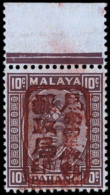 Description N4B (J181a) 1942 10¢ dull purple Sultan Sir Abu Bakar with Japanese Occupation handstamp SG Type 1 in red, top sheet-margin single.