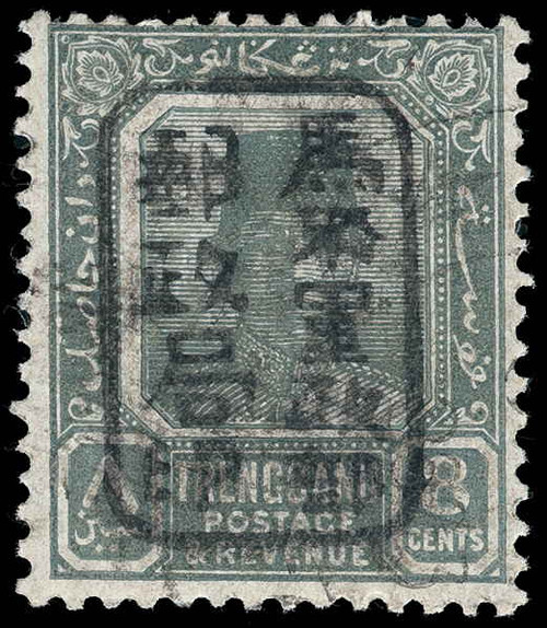 N7 var (J104a) 1942 8¢ grey Sultan Suleiman with Japanese Occupation handstamp SG Type 1in black at Kuala Lumpur, VARIETY - on chalk-surfaced paper, scarce, light cds - unpriced used in Stanley Gibbons, small thin spots.