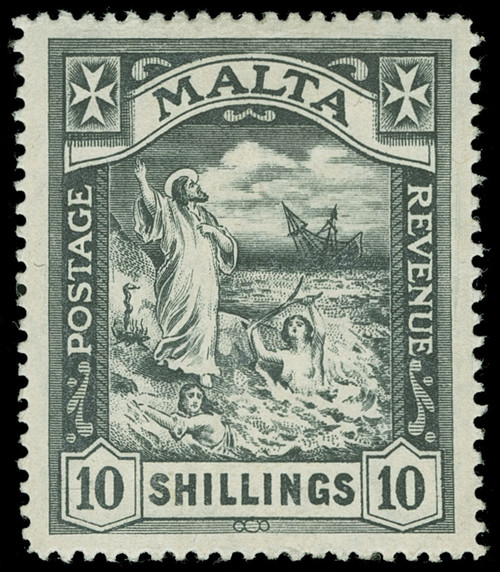 Description 65 (96) 1919 10' black Shipwreck of St. Paul, wmkd MCA, perf 14, rare (only 1530 issued in error on the wrong watermark paper), the great "key" rarity of Malta, a perfectly centered "gem" example!