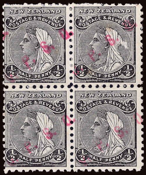 Description O9 (O4) 1891-1906 ½d black Q Victoria, rose "O.P.S.O." handstamp, perf 10x11, block of four, an incredibly rare multiple, OG, selvedge adherence on two stamps, small gum skips.