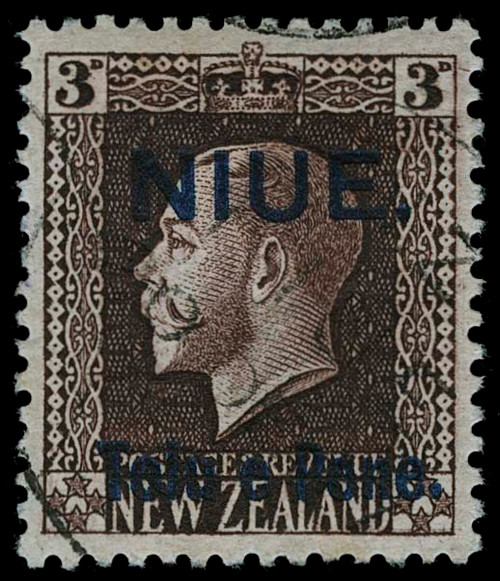 Description 20 (22) 1917 3d chocolate K George V of New Zealand overprinted "NIUE" SG Type 5 and surcharged SG Type 6, perf 14x14½, scarce and undercatalogued, perfectly centered, lightly canceled, seldom ever seen this nice!
