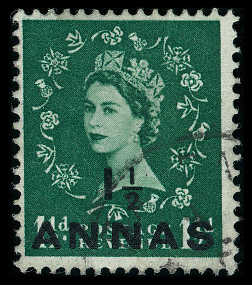 56A (58a) 1956 1½a on 1½d green Q Elizabeth II of Great Britain, wmkd St. Edward's Crown, perf 14, surcharged "1½ ANNAS" (SG Type 3) in error on this watermark, most of the known copies emanated through Southern Stamp Services packet making division w discovered it while sorting out a shipment of mission mixture received from the Middle East, a very rare and difficult stamp, seldom seen and significantly undercatalogued, lightly canceled.