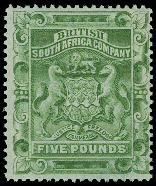 Description 18 (12) 1892 £5 sage-green Coat of Arms, thin wove paper, unwmkd, perf 14½, rare high value.