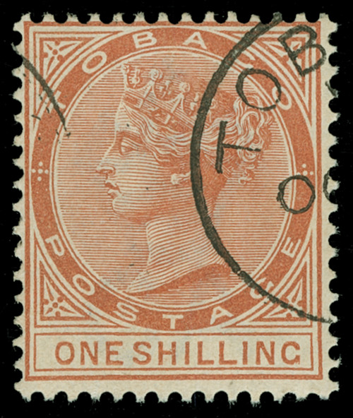 24 (24c) 1896 1' orange-red Q Victoria, wmkd CA, perf 14, this stamp was printed in the color of the 6d by mistake, extremely rare and undercatalogued used as this was the last issued stamp-almost immediately replaced by a T&T stamp and there was a mint remainder of 6000 copies of this issue sold after the fact by the Crown Agents in London.