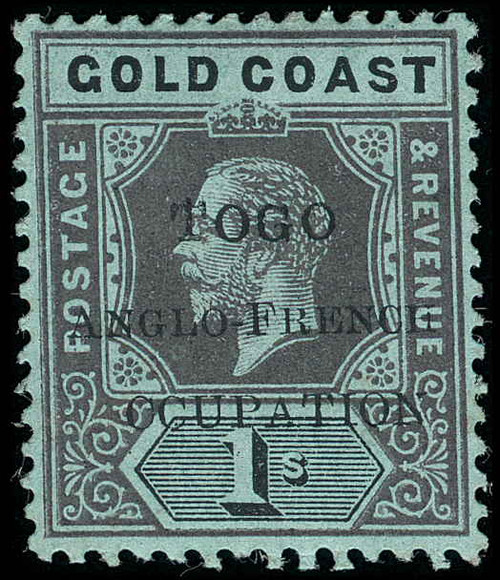 Description 72 var footnoted (H41f) 1915 1' black on green K George V stamp of Gold Coast, "TOGO Anglo-French OCCUPATION" local overprint, VARIETY - first "O" in "OCCUPATION" omitted, rare (only 82 printed), perfectly centered.