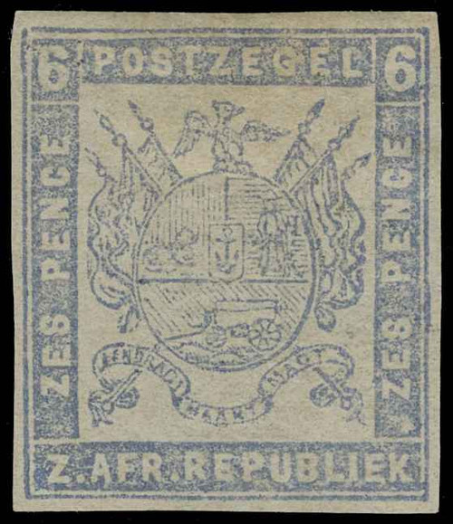 35 (45) 1875 6d blue Coat of Arms^, Stamp Commission printing in Pretoria on very thin, soft opaque (semi-pelure) paper, imperf, four margins, ex-Drysdall.
